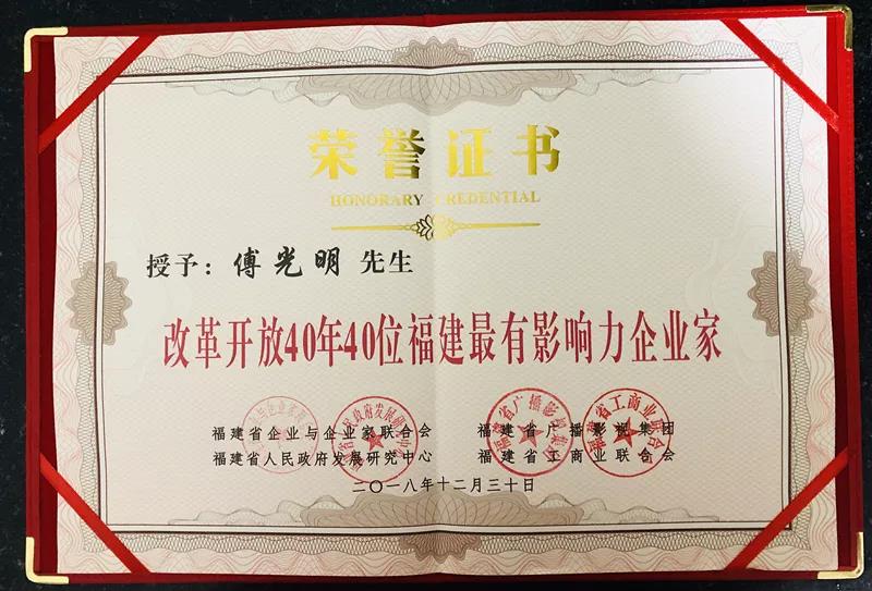改革开放40年40位福建最有影响力企业家评选,是由福建省企业与企业家联合会、福建省广播影视集团、福建省政府发展研究中心、福建省工商业联合会共同开展的人物评选活动,旨在展现福建企业家在改革开放恢宏历程中的突出贡献,回顾总结福建企业家的创新创业经验,梳理企业家先进典型,表彰40年来对福建经济发展做出重大贡献的企业家代表。此次傅光明董事长获奖,不仅是对其”敢为天下先“的创业精神的充分肯定,更是对3003新葡的京集团集团35年来为福建经济发展做出重大贡献的表彰。