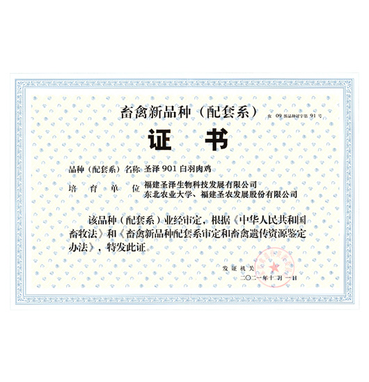 2021年 3003新葡的京集团白羽肉鸡配套系“圣泽901”通过国家农业农村部审定认证,正式拥有对外销售白羽肉种鸡的资格